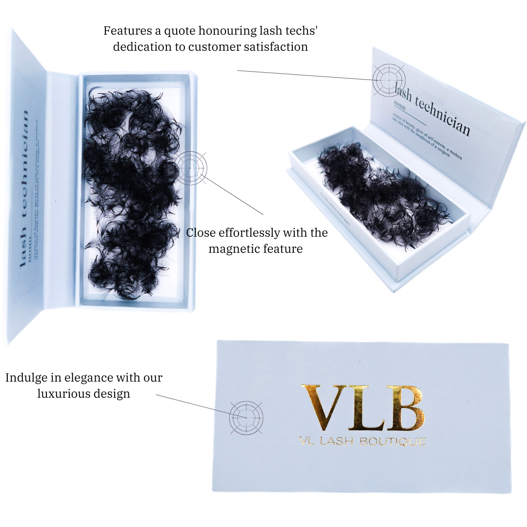 Our collection ranges from volume to mega volume, allowing you to achieve the perfect look for your clients. Each fan is crafted by high-quality professionals using luxury Korean PBT, ensuring uniformity and quality, making your lash application faster and more efficient. The pointy base creates easy application and better retention. Say goodbye to the hassle of creating your own fans and embrace the convenience of our top-tier lash products.